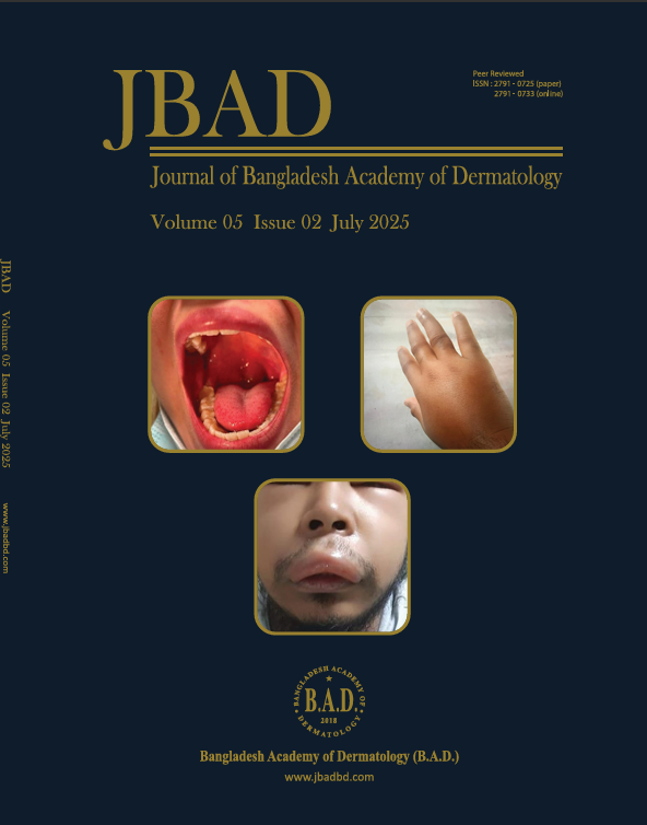 Abstract Background: Alopecia areata (AA) is a chronic, immune-mediated disease characterized by acute or chronic non-scarring hair loss, with heterogeneity in clinical manifestations ranging from patchy hair loss to complete scalp and body hair loss. Though before June 2022 there was no FDA-approved systemic medication for alopecia areata dermatologists prescribe a good number of topical and systemic agents for the treatment of alopecia areata (AA), and in Bangladesh all treatment modalities are not available and prescribed. Methodology: This cross-sectional survey was conducted on 120 dermatologists to see the prescription pattern in alopecia areata. Results: The responses of 120 dermatologists were analyzed. The most common treatments prescribed for AA were topical Steroids (91%), topical calcineurin inhibitors (88%), biotin (73%), Zn (73%) minoxidil (60%)tofacitinib (46%), methotrexate (3%), cryotherapy (2%), PUVA/NBUVB, anthralin. At the time of the survey, 46% of patients were being prescribed a combination of corticosteroids (23%), injectable corticosteroids(12%), and topical corticosteroids/topical calcineurin inhibitor. Conclusions: This analysis provides a snapshot of the different local and systemic treatment options currently being used in a real-world treatment setting. Keywords: Alopecia areata; Cross-sectional survey; Treatment patterns. |